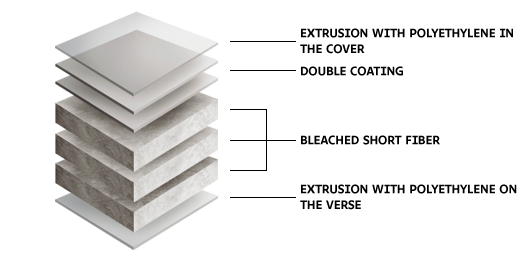 Coated paperboard for cupstock, high brightness, coated on the topside with 14 g/m² brilliant polyethylene with corona treatment and 14 g/m² matte polyethylene on the backside, without corona.